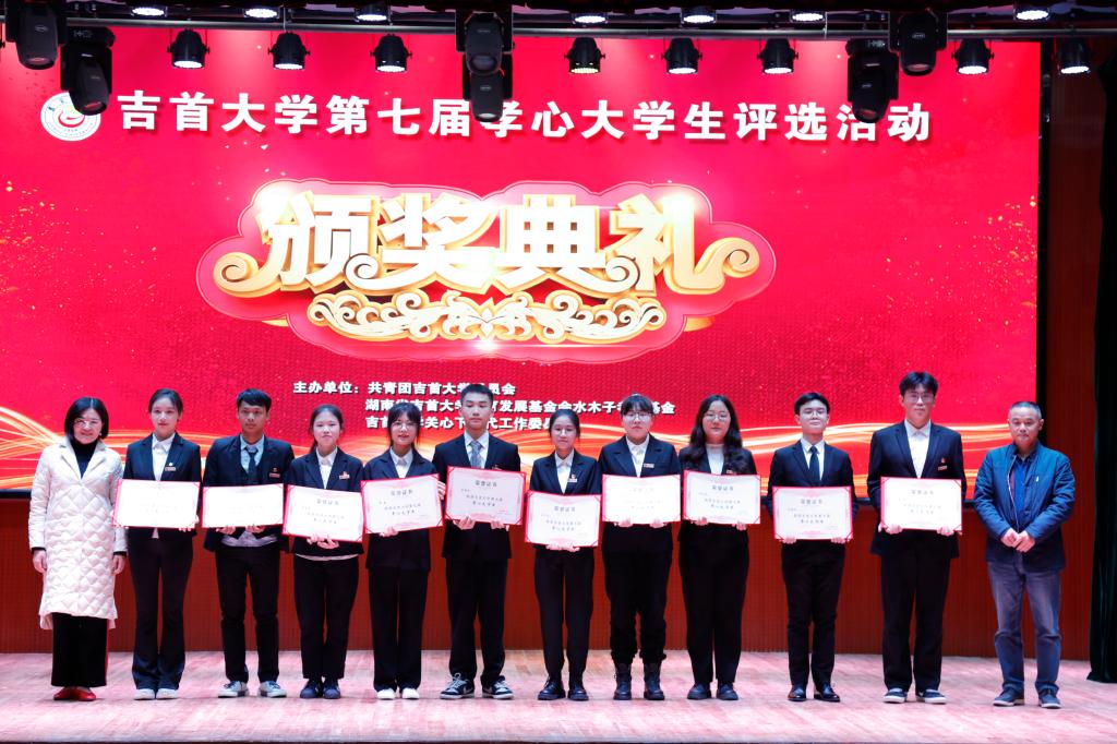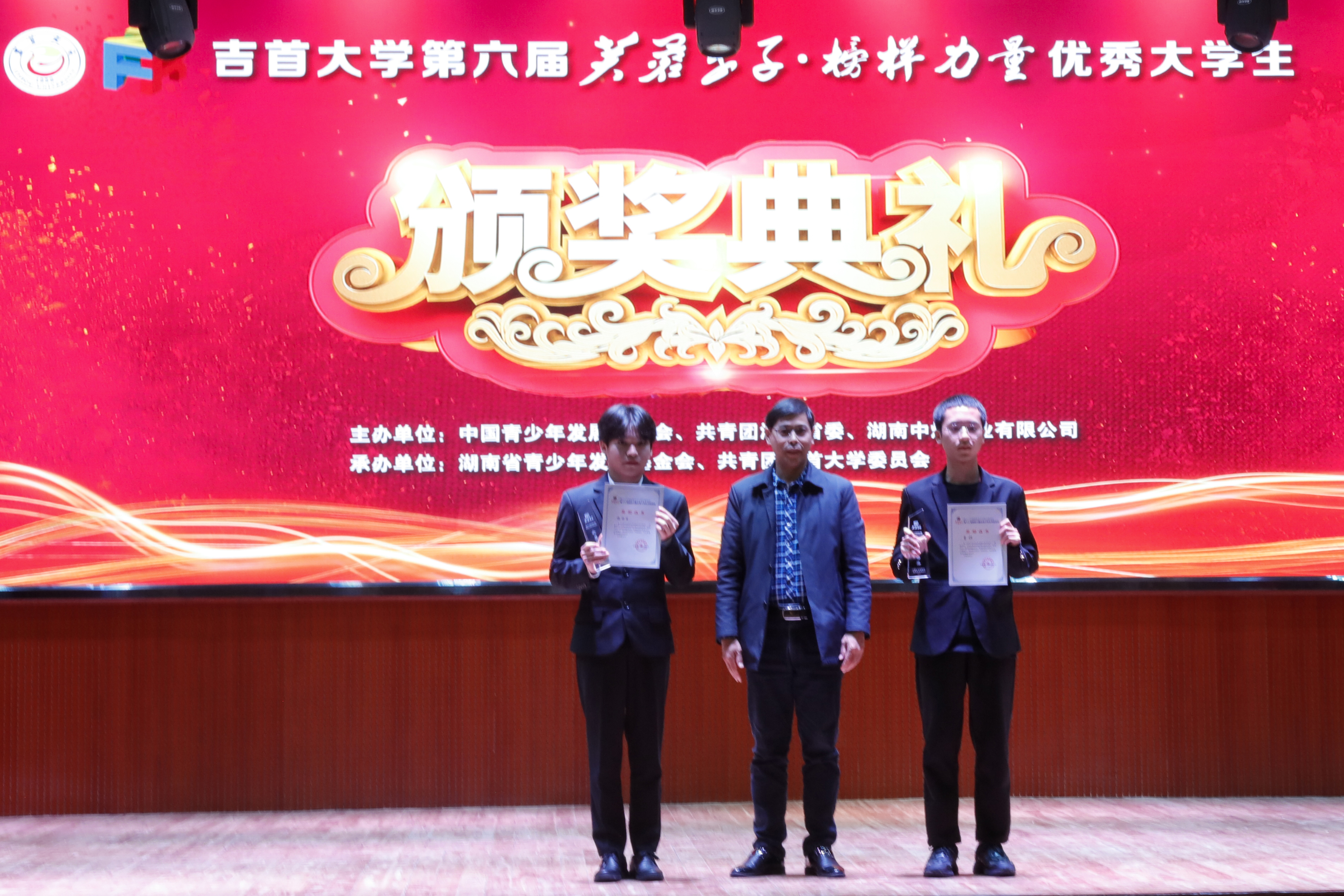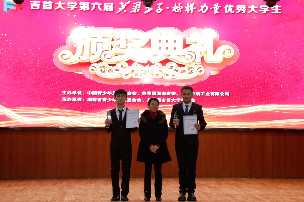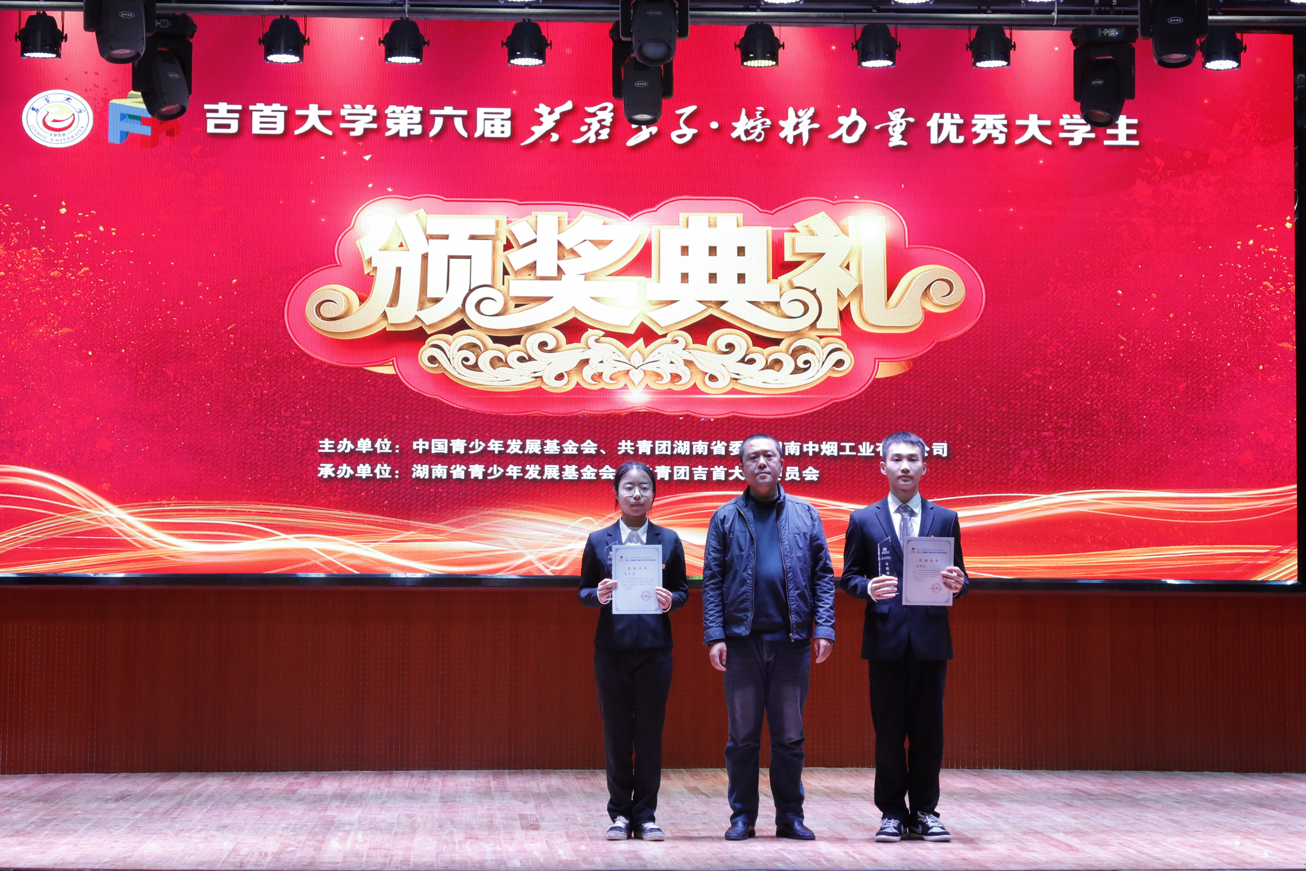 本网讯(学生记者 刘巧华 李慧凝 通讯员 杜欢 姜博雅)11月29日下午,我校第六届“芙蓉学子·榜样力量”优秀大学生、第七届“孝心大学生”、第八届“校园之星”颁奖典礼在大田湾校区礼堂举行。校党委委员、副校长王艳,兴达公司人事经理曾英,湘西州民族青少年发展基金会秘书长孙少宣,学校教育发展基金会理事长李荣光,校党委学生工作部、校团委、教务处、招生就业处等部门领导为获奖学子颁奖。