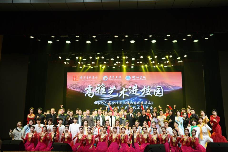 本网讯(通讯员 欧阳晖)12月10日晚,我校砂子坳校区实验剧场内华灯璀璨、座无虚席。由湖南省教育厅、中共湖南省委宣传部、湖南省财政厅、湖南省文化和旅游厅联合主办,我校与邵阳学院联合承办的湖南省高雅艺术进校园活动——国家艺术基金项目《潇湘春风暖天山》刘淮保声乐作品音乐会在此举行。我校党委副书记王绯,邵阳学院党委副书记赵敏丽,我校副校长周华忠、罗惠缙,以及两校相关职能部门领导、师生代表齐聚一堂,共同聆听这场融民族情怀、时代精神与艺术匠心于一体的音乐盛宴。音乐会由邵阳学院手拉手艺术团倾情呈现,艺术团团长、项目负责人刘淮保教授是我校音乐舞蹈学院1988级音乐教育专业杰出校友,他深耕音乐创作与教育二十余载,其作品始终紧扣时代脉搏,扎根人民生活。本场音乐会以“新时代壮丽篇章”为叙事主线,精心编排为《山海同心》《振兴诗画》《乡音筑梦》《时代丰碑》四个篇章,通过16首原创精品,艺术化地描绘了从雪域天山到三湘四水的壮美画卷与时代变迁。